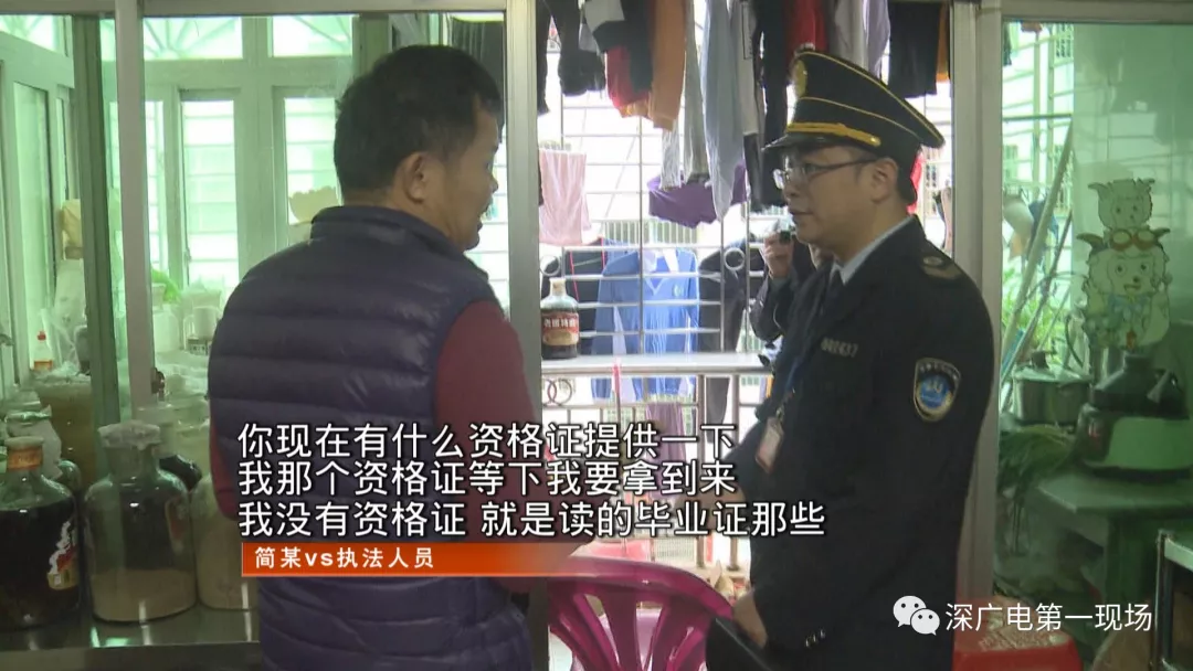 簡某嘴上說他有醫(yī)學(xué)院畢業(yè)證,但最后出示的是20多年前取得的,《廣州市社會(huì)力量辦各類校班結(jié)業(yè)證書》及《中醫(yī)醫(yī)療函授學(xué)習(xí)證書》,衛(wèi)監(jiān)人員說這都不算醫(yī)師執(zhí)業(yè)資格。對于沒有資格證的問題,簡某表示自己曾經(jīng)咨詢過,原來可以到湛江進(jìn)行考試,但現(xiàn)在已經(jīng)不行了。