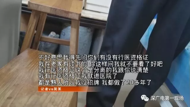 簡(jiǎn)某的名片上,印著他是醫(yī)學(xué)院畢業(yè),有20多年治療經(jīng)驗(yàn),他的治療對(duì)骨折脫位通風(fēng)腰突癥有特效,甚至半身不遂后遺癥都可以治。名片上,簡(jiǎn)某有兩個(gè)營(yíng)業(yè)點(diǎn),分別在龍崗坂田和布吉。但地址只顯示大范圍,沒有房號(hào)。原來,找他看病,先得電話預(yù)約,然后他才告訴你具體房號(hào)。昨天,記者想辦法預(yù)約到簡(jiǎn)某,他說可以在坂田五和路附近的吉豐樓給記者看病。記者來到現(xiàn)場(chǎng),看到樓下沒有任何標(biāo)識(shí),不過電梯里有塊不大的牌子,寫著“跌打骨傷”電話號(hào)碼和門鈴0305字樣。