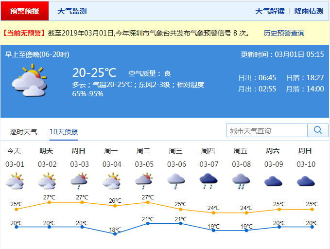 深圳新聞網(wǎng)2019年3月1日訊(記者陳婕)今天的陽光似乎溫暖過了頭,太陽的出現(xiàn),緩解了潮濕的情況,未來兩天深圳繼續(xù)溫暖濕潤,早晚能見度較低,周末兩天多云,部分時(shí)間可見陽光。而從3月3日開始,深圳將連續(xù)有雨。