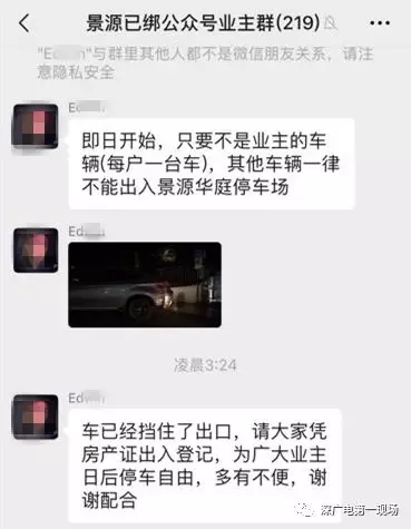 有業(yè)主介紹,今天凌晨3點左右,這輛寶馬車的車主曾在業(yè)主群里留言,稱他的車已經(jīng)擋住了出口,需要業(yè)主憑房產(chǎn)證才能從此經(jīng)過。