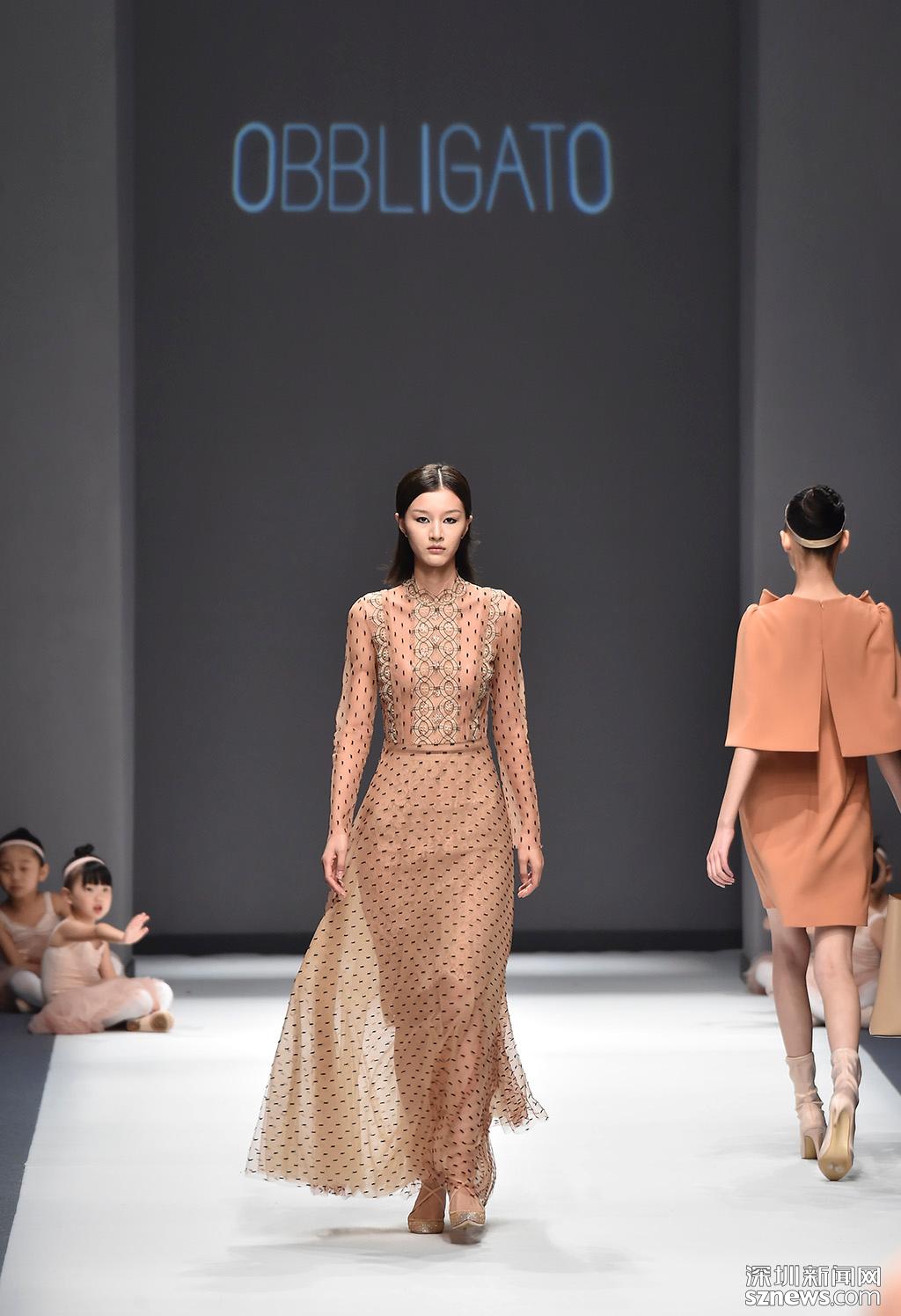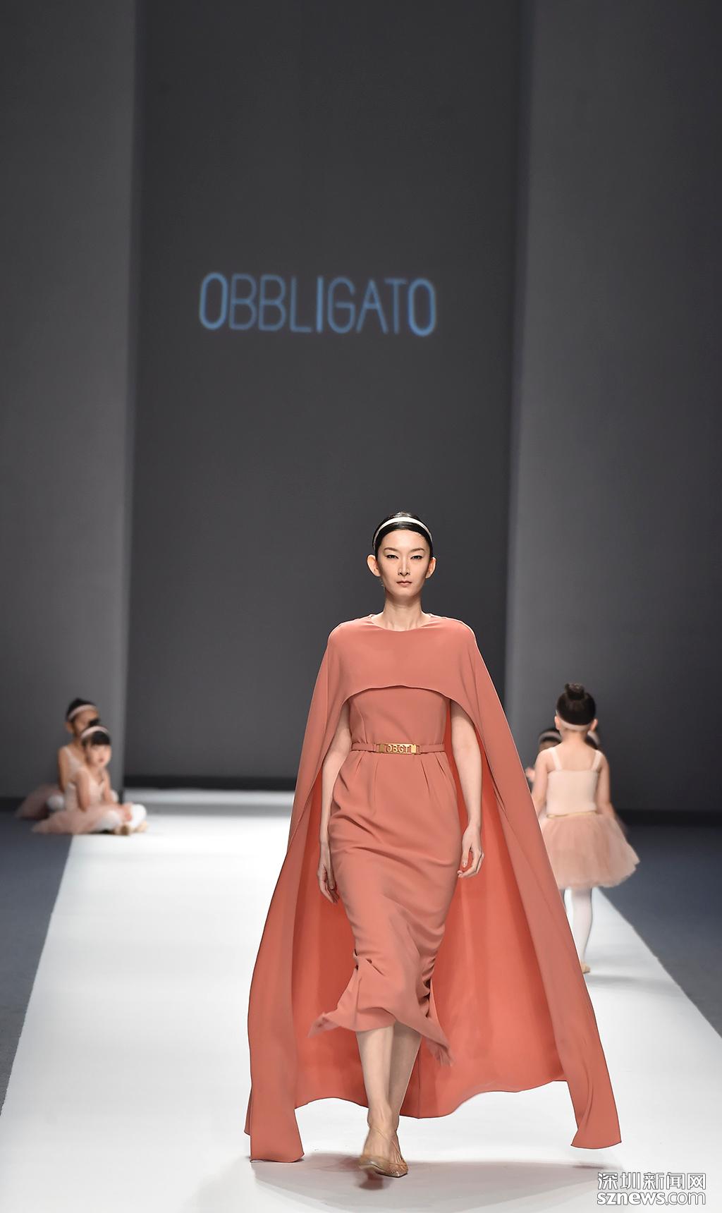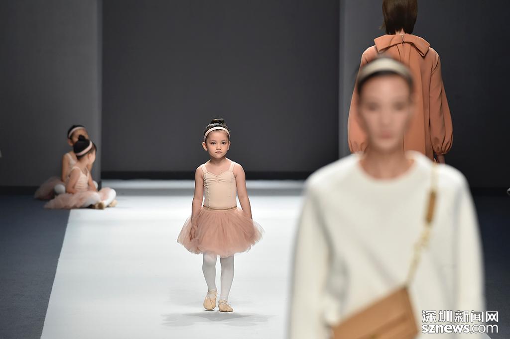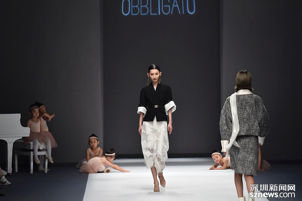 品牌OBBLIGATO展示環(huán)節(jié),參展的一位小孩子望向正在走臺的模特