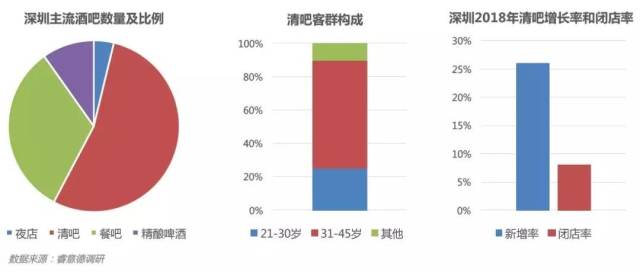 報(bào)告著重以夜店、清吧、餐吧、精釀啤酒吧為主要研究對(duì)象。其中,清吧的數(shù)量在主流酒吧業(yè)態(tài)中占比過半——2018年,清吧在深圳超過600家,占據(jù)市場的54%,開業(yè)量超過130家,閉店數(shù)則超過40家,精細(xì)運(yùn)營成為追求現(xiàn)象級(jí)爆紅的“網(wǎng)紅”酒吧發(fā)展的主要瓶頸。
