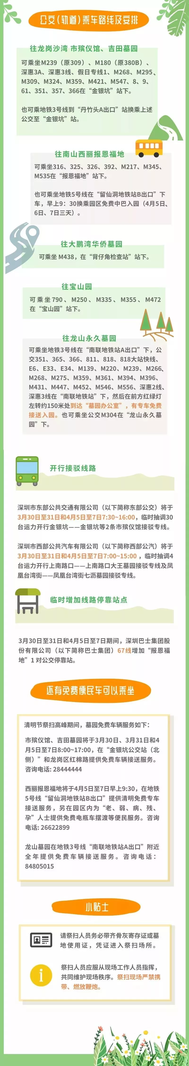 交警部門將視情況對上述地點進(jìn)行交通管制,為滿足市民朋友出行祭掃需要,除了給大家準(zhǔn)備出行指引外還將開行墓園接駁專線、增加停靠站、增加運(yùn)力請大家文明出行、綠色出行。