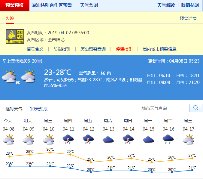 深圳新聞網(wǎng)2019年4月8日訊 深圳市氣象臺預計,本周前期我市無降雨,后期將轉(zhuǎn)多陣雨天氣。具體來說:8日多云可見陽光,氣溫23-28℃,南風2-3級,濕度55%-90%;9-10日多云為主,早晚有輕霧或霧;11日多云間陰天,傍晚或夜間轉(zhuǎn)雷陣雨;12日陰天有陣雨或雷陣雨,沿海和高地陣風6-7級,氣溫下降;13日陰天間多云,偶有小雨。