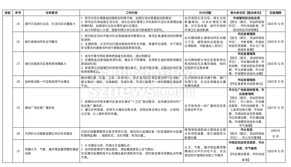 附:《深圳市提升臺風(fēng)暴雨災(zāi)害防御能力重點任務(wù)實施方案一覽表》
