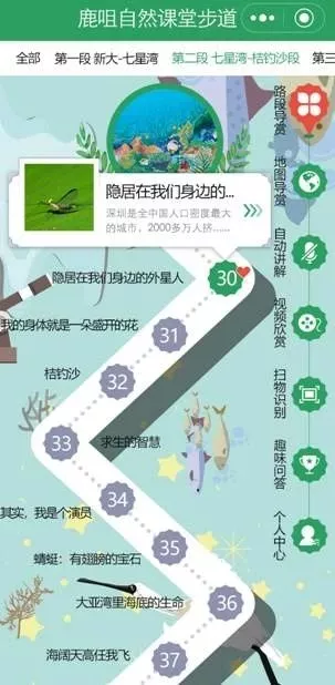 隨著綠道行進(jìn)的深入,記者來到第一個(gè)自然觀察研習(xí)點(diǎn),這里配置有自然研習(xí)導(dǎo)賞標(biāo)識(shí)牌,牌上有植物動(dòng)物的照片及介紹,牌子的角落有供游客學(xué)習(xí)的二維碼。記者了解到,新區(qū)同時(shí)開發(fā)建立一套APP自然課堂學(xué)習(xí)系統(tǒng),在綠道全程配套建設(shè)64個(gè)實(shí)地自然觀察研習(xí)點(diǎn),設(shè)置了260余個(gè)自然研習(xí)導(dǎo)賞標(biāo)識(shí),接入專業(yè)智能識(shí)別軟件,配以體量龐大生物影像數(shù)據(jù)庫。掃碼進(jìn)入APP就可以通過文字、圖片和音像資料了解到“大鹿線”全景介紹和分區(qū)介紹,以及物種相關(guān)知識(shí)。同時(shí),該系統(tǒng)利用手機(jī)GPS定位技術(shù),為行進(jìn)中的市民游客自動(dòng)講解所到之處的自然課堂語音課程。來自羅湖的資深驢友李先生告訴記者,來“大鹿線”徒步,不僅鍛煉身體愉悅心情,還可以學(xué)到豐富的自然知識(shí),打開APP行走全程,猶如參觀了一座多維一體的山海“全景博物館”。
