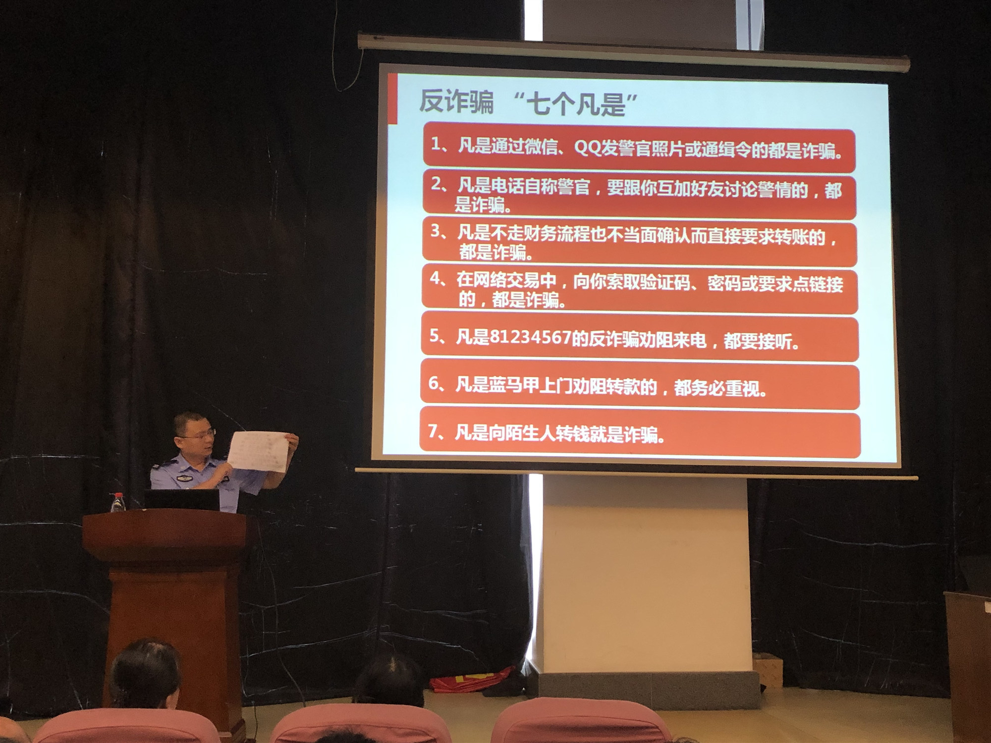 4月12日下午,惠杰副所長、社區(qū)民警黃旭波、孫立波在財(cái)富廣場小禮堂開展香蜜湖“反詐騙課堂”第一場,向財(cái)富廣場各公司負(fù)責(zé)人、財(cái)務(wù)人員開展反詐騙宣傳,“反詐騙宣傳”PPT包含反詐騙工作面臨的嚴(yán)峻形式、電信詐騙的常見手段、各類案例及宣傳視頻、電信詐騙的防范要點(diǎn)、以及社區(qū)民警的微信二維碼名片等等。此次宣傳借用大廈的會(huì)議室、物業(yè)單位的小禮堂,將本樓的商戶、公司集中在一起,形成區(qū)域效應(yīng);突出重點(diǎn)人員,主要針對單位負(fù)責(zé)人、財(cái)務(wù)人員,切實(shí)提高居民自我防范意識。