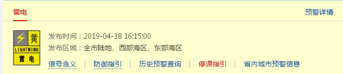 深圳市氣象臺于2019年04月18日16時15分在全市發(fā)布雷電預(yù)警,預(yù)計30-60分鐘內(nèi)全市將逐漸自西向東轉(zhuǎn)雷陣雨,按照防御預(yù)案停止戶外易燃易爆危險作業(yè),并加強危化場所安全管理,正值下班放學高峰期,請注意防御。