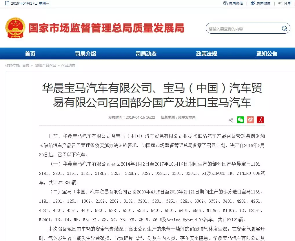 據(jù)國(guó)家市場(chǎng)管理總局質(zhì)量發(fā)展局官網(wǎng),日前,華晨寶馬汽車有限公司及寶馬(中國(guó))汽車貿(mào)易有限公司根據(jù)《缺陷汽車產(chǎn)品召回管理?xiàng)l例》和《缺陷汽車產(chǎn)品召回管理?xiàng)l例實(shí)施辦法》的要求,向國(guó)家市場(chǎng)監(jiān)督管理總局備案了召回計(jì)劃,決定自2019年8月30日起,召回以下汽車: