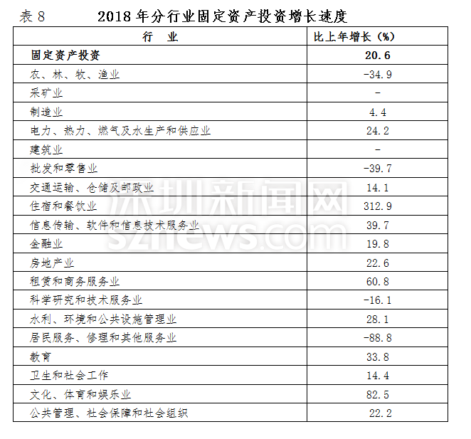2018年,深圳全市固定資產(chǎn)投資比上年增長20.6%。其中,房地產(chǎn)開發(fā)投資增長23.6%;非房地產(chǎn)開發(fā)投資增長18.4%。分投資主體看,國有經(jīng)濟(jì)投資增長36.7%;民間投資增長12.5%;港澳臺(tái)商經(jīng)濟(jì)投資下降22.6%;外商經(jīng)濟(jì)投資增長30.3%。