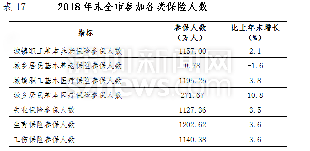 年末全市有1157.00萬人參加了城鎮(zhèn)職工基本養(yǎng)老保險(xiǎn),1127.36萬人參加了失業(yè)保險(xiǎn)。