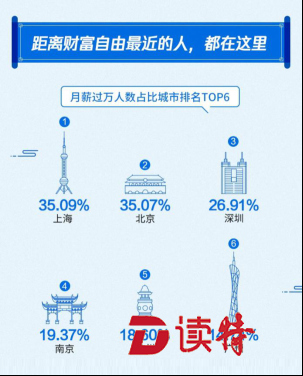 深圳特區(qū)報2019年4月23日訊 月薪過萬人數(shù)占比城市排名 TOP6:上海、北京、深圳、南京、杭州、廣州;其中,北上廣深受訪者中月薪在5000至8000元人數(shù)居多;薪酬水平最高的三個行業(yè)分別是:互聯(lián)網(wǎng)、房地產(chǎn)、金融;受訪者中工作10年月薪過萬人數(shù)不足三成、過六成受訪者工資不及預期、逾七成受訪者因為工資考慮跳槽;五成受訪者用于理財?shù)腻X不足工資20%、近五成受訪者在第三方互聯(lián)網(wǎng)理財平臺進行工資理財。