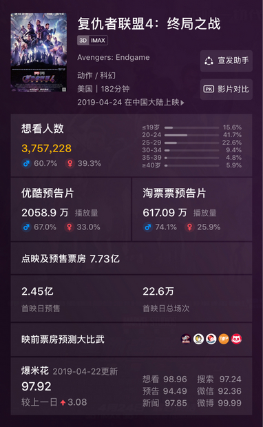 深圳新聞網(wǎng)4月24日訊(記者 陳婕)相信你的朋友圈已經(jīng)被“復(fù)聯(lián)4”占據(jù)了領(lǐng)地,而小記認(rèn)識(shí)的英雄還湊不齊一桌麻將。截至24日00點(diǎn),《復(fù)仇者聯(lián)盟4》預(yù)售已破7億!超《美國隊(duì)長2》總票房,在《復(fù)聯(lián)4》的預(yù)售峰值期,淘票票預(yù)售市場占比過半。