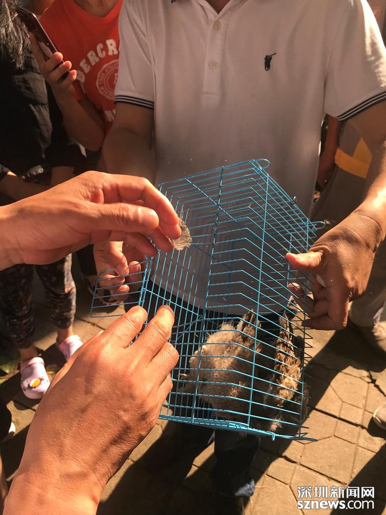 小區(qū)保安先把小貓頭鷹裝進(jìn)籠子,等待動保所的工作人員到來。