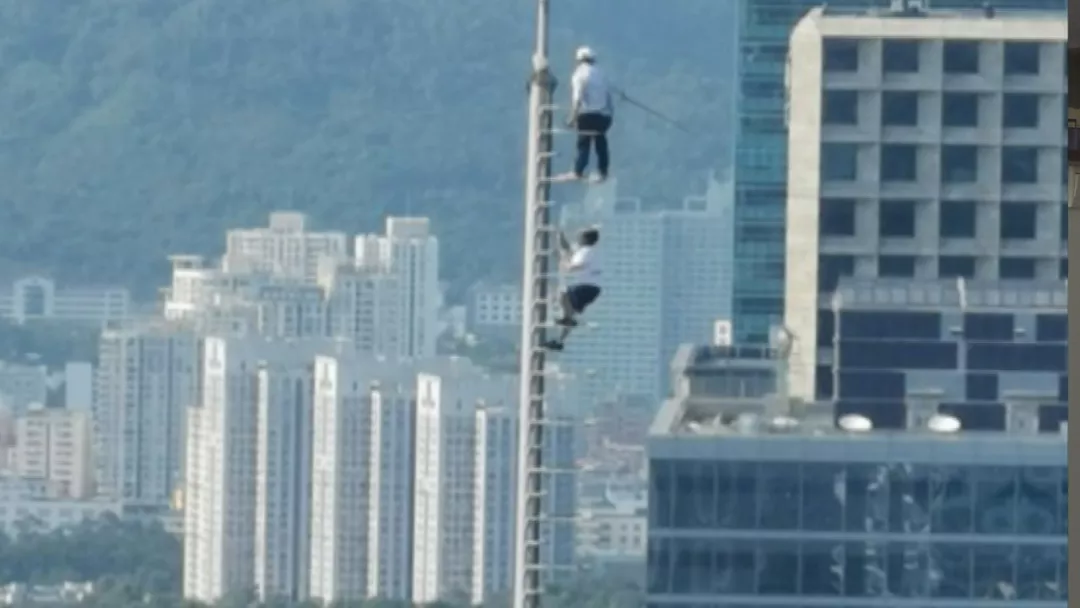 這段視頻拍攝于昨天上午9點(diǎn)左右,視頻拍攝者李先生表示,當(dāng)時(shí)他正在公司值班,往窗外一看,卻發(fā)現(xiàn)對面的信息樞紐大廈塔頂,靠近中國電信招牌的位置有動(dòng)靜,定睛一看,居然是兩個(gè)人在塔頂?shù)蔫F桿上游走。