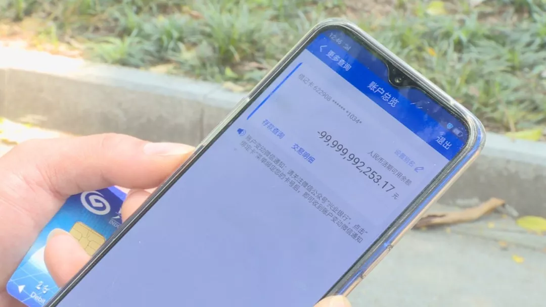 楊先生在今年2月中旬,經(jīng)朋友介紹來到深圳坪山工作,公司統(tǒng)一辦理了興業(yè)銀行的工資卡。楊先生說,第一個月發(fā)工資時,他就發(fā)現(xiàn)工資取不出來,就以為是銀行卡沒激活,沒在意??墒钱?dāng)?shù)?月份的工資也用不了時,楊先生趕緊下載了手機銀行,這一查,嚇了一跳!賬戶余額顯示:-99,999,992,253.17 (負(fù)999億余元)。