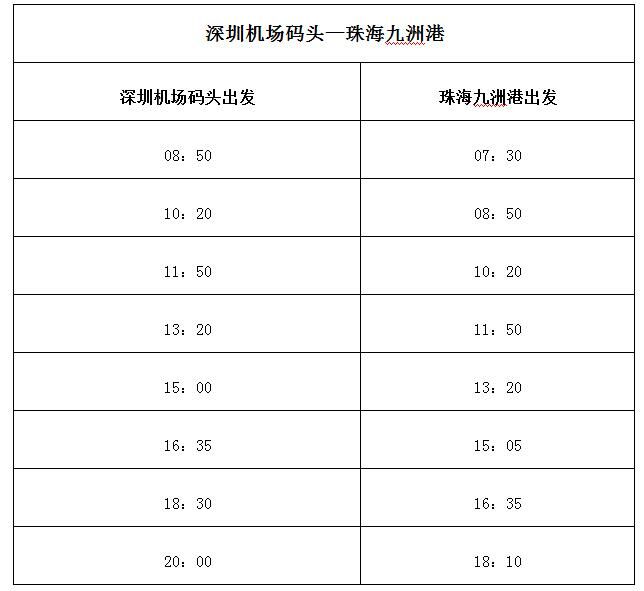 據(jù)深圳航運(yùn)集團(tuán)介紹,深圳機(jī)場(chǎng)碼頭至珠海九洲港航線開(kāi)通后,每天共計(jì)8個(gè)航班16個(gè)航次往返兩地,服務(wù)時(shí)間從早上7時(shí)30分一直到晚上20時(shí),基本實(shí)現(xiàn)公交化運(yùn)營(yíng)。其中,由深圳機(jī)場(chǎng)碼頭出發(fā)的時(shí)間分別為8時(shí)50分、10時(shí)20分、11時(shí)50分、13時(shí)20分、15時(shí)、16時(shí)35分、18時(shí)30分和20時(shí);由珠海九洲港出發(fā)的時(shí)間分別為7時(shí)30分、8時(shí)50分、10時(shí)20分、11時(shí)50分、13時(shí)20分、15時(shí)05分、16時(shí)35分及18時(shí)10分。