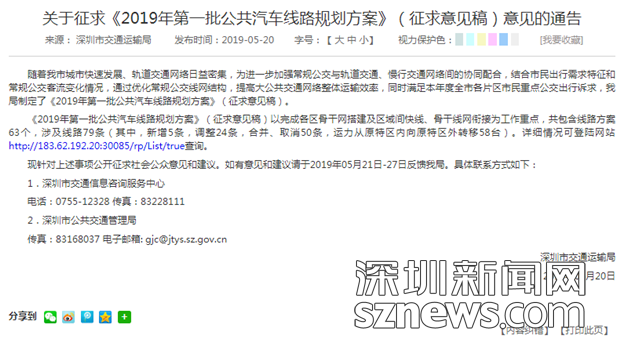 目前,市民可登陸網(wǎng)站http://jtys.sz.gov.cn/查詢詳細(xì)情況。同時,深圳市交通運(yùn)輸局就上述事項(xiàng)公開征求社會公眾意見和建議,如有意見和建議請于2019年05月21日-27日反饋至深圳市交通運(yùn)輸局。具體聯(lián)系方式如下: