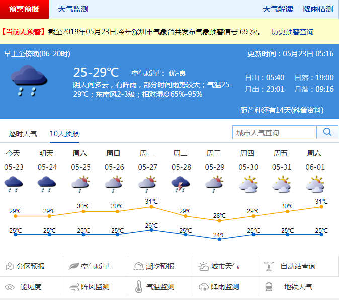 深圳新聞網(wǎng)2019年5月23日訊 21日夜間至22日白天,寶安、光明和南山出現(xiàn)大雨,其他地區(qū)出現(xiàn)小雨。預(yù)計(jì)今明兩日我市陰天到多云,有中到大雨,局部暴雨;25-27日多云為主,有短時陣雨或雷陣雨;28日有雷陣雨;29日多云有短時陣雨。