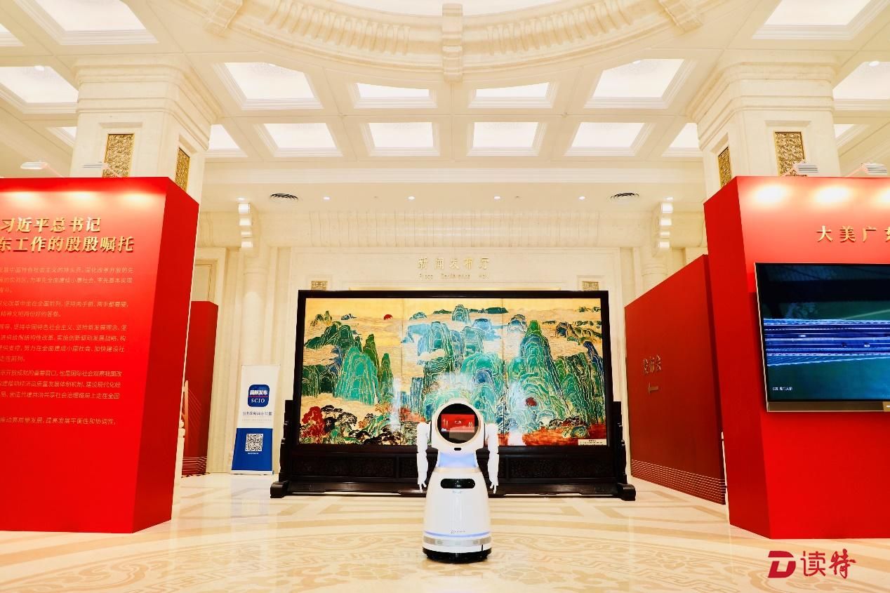 新中國成立70周年廣東省成果展入口處克魯澤提供智能迎賓服務(wù)。