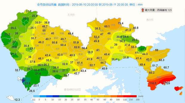 圖說(shuō):11日深圳全市日降雨量(單位:毫米,截止至11日16時(shí)05分)