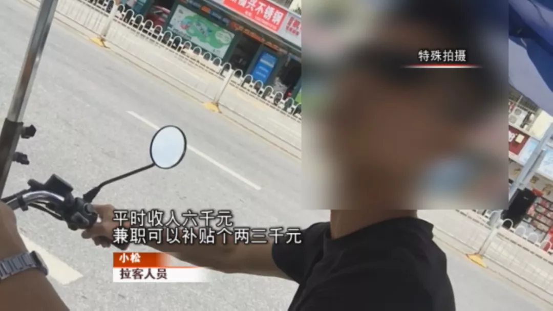 這些拉客人員年齡大多都在50歲左右,不過也有相對年輕的面孔,三十出頭的小松(化名)告訴記者他本身是某公司的專職司機,為了補貼家用,每天下午下班后都會騎著電單車兼職來拉客。
