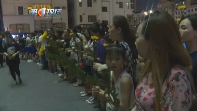晚上7點(diǎn)30分,大家在有序組織下,排成一隊,逐一走到花籃前,放下手中的鮮花,雙手合十,并鞠躬致意。