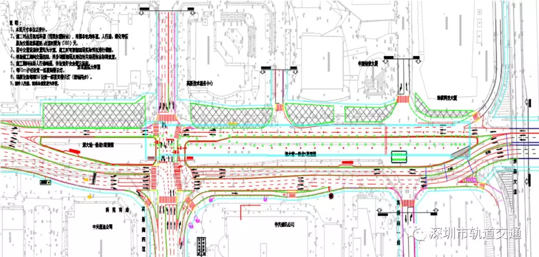 由于深大站位于高新科技園附近,上下班期間人、車流量較大,為不妨礙正常交通,項目部決定利用科苑路西側2條現狀車道及東側5條新建車道對科苑路交通進行疏解,首先圍蔽車站東半幅進行地連墻及抗拔樁施工,并同步實施車站西側給排水改遷施工及西側2條新建車道疏解路面施工。