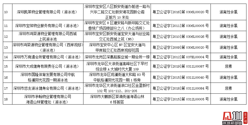 記者獲悉,深圳市夢六健身有限公司(游泳池)pH值和游離性余氯指標不合格,深圳市百利行物業(yè)發(fā)展有限公司中信紅樹灣花城物業(yè)管理處(游泳池)、深圳市大成健身有限責任公司(游泳池)、深圳市悠友游泳健身會有限公司(游泳池)尿素指標不合格,加福投資(深圳)有限公司福朋喜來登酒店(游泳池)、深圳市蓮花物業(yè)管理有限公司彩田村游泳場、深圳大中華國際酒店管理有限公司大中華希爾頓酒店(游泳池)、深圳市京基物業(yè)管理有限公司濱河時代物業(yè)服務中心(游泳池)、深圳新都酒店股份有限公司新都酒店(游泳池)、深圳陽光酒店(游泳池)、深圳市金地物業(yè)管理有限公司翠盈嘉園管理處(游泳池)、深圳凱萊物業(yè)管理有限公司(游泳池)、深圳市寶繽物業(yè)服務有限公司(游泳池)、深圳市鴻榮源物業(yè)管理有限公司西城上筑游泳池、深圳市鴻榮源物業(yè)管理有限公司(西岸觀?。ㄓ斡境兀⑸钲谑腥f商通會所管理有限公司(游泳池)、深圳市國隆體育發(fā)展有限公司中航格瀾陽光花園一期游泳池、深圳市承翰物業(yè)管理有限公司海語山林管理處(游泳池)游離性余氯指標不合格。衛(wèi)生監(jiān)督部門已責令抽檢結(jié)果不合格單位立即整改,并跟蹤整改情況。