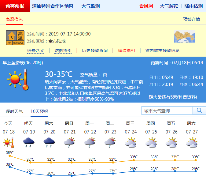 市氣象臺(tái)提醒:今日高溫酷熱天氣持續(xù),需注意防暑防曬,全市高溫橙色預(yù)警信號(hào)生效中,用人單位應(yīng)視情況于12時(shí)至15時(shí)停止戶外或高溫作業(yè),縮短連續(xù)作業(yè)時(shí)間;可能出現(xiàn)雷雨大風(fēng)等強(qiáng)對(duì)流天氣;受“丹娜絲”影響,18日至19日廣東東部海面及南海東北部海面風(fēng)力較大。