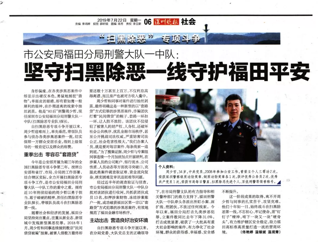這一階段成果的取得,離不開(kāi)周少哲與同事的扎實(shí)苦干、攻堅(jiān)克難。他們十年如一日,始終戰(zhàn)斗在掃黑除惡第一線,不忘初心、牢記使命,用“釘釘子”精神,啃下一塊又一塊“硬骨頭”,有力維護(hù)轄區(qū)安全穩(wěn)定,助力福田高標(biāo)準(zhǔn)高質(zhì)量打造一流的營(yíng)商環(huán)境。