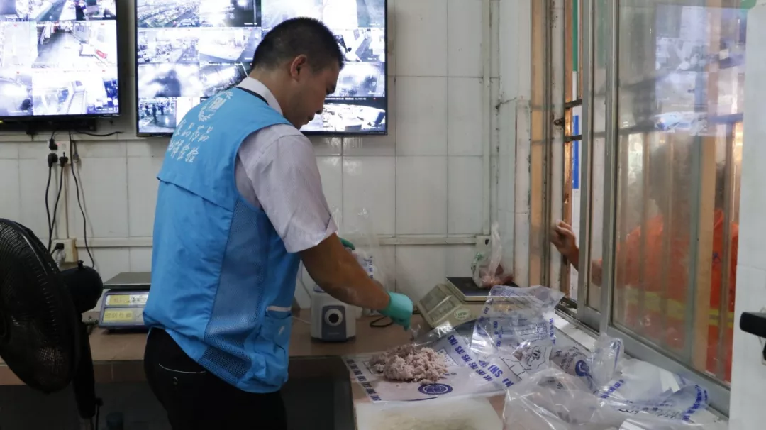 執(zhí)法人員根據(jù)市場(chǎng)開(kāi)辦方提供的市場(chǎng)檔位明細(xì)表,首先隨機(jī)選取了市場(chǎng)內(nèi)的肉檔、水產(chǎn)品檔、菜檔,逐一進(jìn)行檢查,對(duì)檔位的營(yíng)業(yè)執(zhí)照、臺(tái)賬建立情況檢查無(wú)誤后,執(zhí)法人員又隨機(jī)指定了檢查品種,由快檢人員現(xiàn)場(chǎng)開(kāi)展快檢工作。