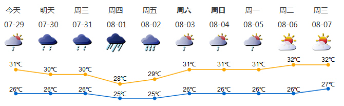 預計30-31日陰天間多云,有陣雨或雷陣雨,局部暴雨;8月1日 -2日有一次暴雨降雨過程。8月3日 -5日降雨減弱,多云有陣雨或雷陣雨。