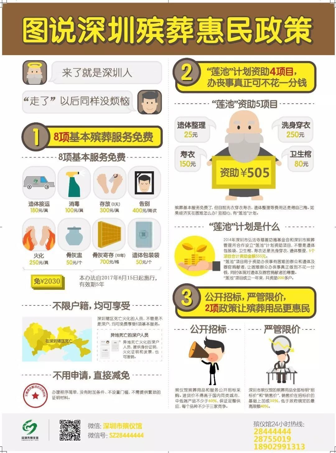 深圳的惠民殯葬服務(wù)有哪些?據(jù)了解,自2012年6月15日起,我市開始實施《深圳市免除殯葬基本服務(wù)費用實施辦法》,在全省率先為全體居民實施基本殯葬服務(wù)免費,免費項目涵蓋9項,包括遺體接運費(普通殯葬專用車)、遺體存放費(3天以內(nèi))、遺體告別廳租用費(小型告別廳)、遺體火化費(普通火化爐)、骨灰寄存費(10年以內(nèi))或生態(tài)葬(海葬、樹葬)、遺體消毒100元、骨灰盒(盅)(50元)、遺體包裹袋,免費總額為2030元。截至今年4月,深圳已累計投入1.6億多元用于殯葬基本服務(wù)。
