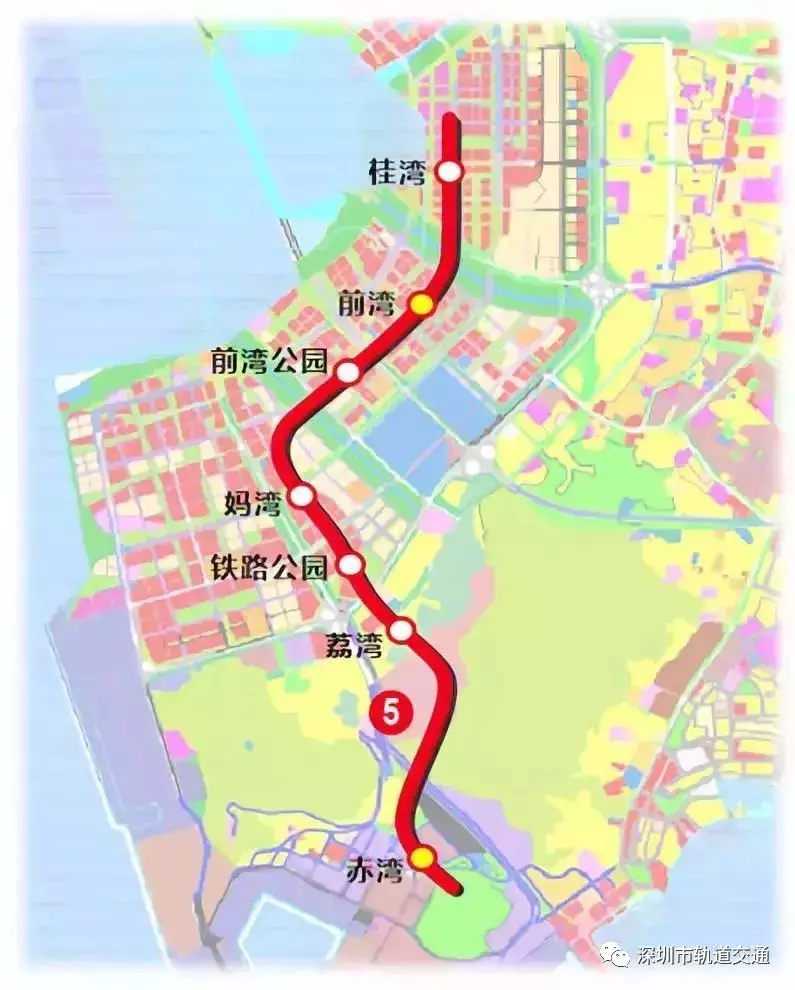 地鐵5號(hào)線南延段,即5號(hào)線二期工程,北起于5號(hào)線前海灣站,經(jīng)前海、南山,終點(diǎn)與地鐵2號(hào)線赤灣站換乘。線路全長約7.7千米,全線采用地下敷設(shè)方式。該線路設(shè)站7座,分別為:赤灣、荔灣、鐵路公園、媽灣、前灣公園、前灣、桂灣。