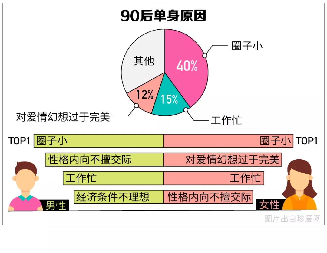 調(diào)查結(jié)果發(fā)現(xiàn),圈子?。?0%)、工作忙(15%)、對(duì)愛(ài)情幻想過(guò)于完美(12%)為90后單身的主要原因。就性別差異而言,除了圈子小之外,男性單身的主要原因是性格內(nèi)向不擅交際(33.53%)、工作忙(32.07%)以及經(jīng)濟(jì)條件不理想(19.02%)。女性單身的主要原因則是對(duì)愛(ài)情幻想過(guò)于完美(29.67%)、工作忙(28.04%)及性格內(nèi)向不擅交際(14.82%)。從學(xué)歷背景看,學(xué)歷越高越容易受困于生活圈子小和工作忙帶來(lái)的擇偶問(wèn)題,而且博士人群對(duì)愛(ài)情幻想過(guò)于完美的比例比其他學(xué)歷的人群更高。