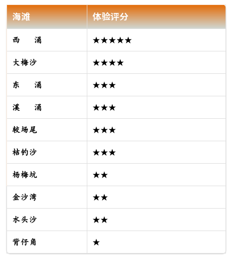 連日來,記者兵分多路,以自西向東、距離市區(qū)“由近及遠”的方向沿海暴走,對其中10個知曉率最高的海灘進行體驗式走訪,以“開放情況、是否收費、能否停車、便民服務(wù)、沙灘清潔、海域安全”六個方面為指標(biāo),以五星為滿分進行了好感度評分。