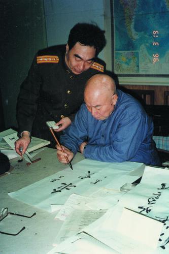 ▲1996年軍旅作家吳東峰(左)到開國上將肖克(右)家中采訪時,蕭克將軍在他墨香陣陣的書房內(nèi)給他寫下‘求實(shí)’兩個大字。