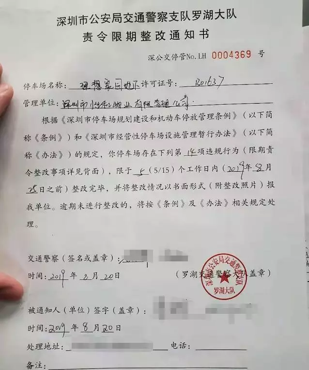 深圳交警巡查至深圳市怡和物業(yè)有限管理公司理想家園地下停車場(chǎng)時(shí),發(fā)現(xiàn)該停車場(chǎng)數(shù)據(jù)未與停車場(chǎng)監(jiān)管系統(tǒng)正常連接,民警按照停車場(chǎng)管理制度向該停車場(chǎng)負(fù)責(zé)人開(kāi)具責(zé)令限期整改通知書。
