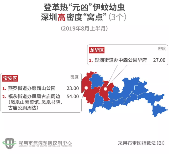 2019年8月1日-15日,通過(guò)對(duì)全市419個(gè)監(jiān)測(cè)點(diǎn)進(jìn)行伊蚊密度監(jiān)測(cè),發(fā)現(xiàn)深圳蚊媒密度總體較高,不符合防控要求的監(jiān)測(cè)點(diǎn)有237個(gè),占了56.56%,其中——高傳播風(fēng)險(xiǎn)的有3個(gè)點(diǎn);中度傳播風(fēng)險(xiǎn)的有64個(gè)點(diǎn);低度傳播風(fēng)險(xiǎn)的有179個(gè)。