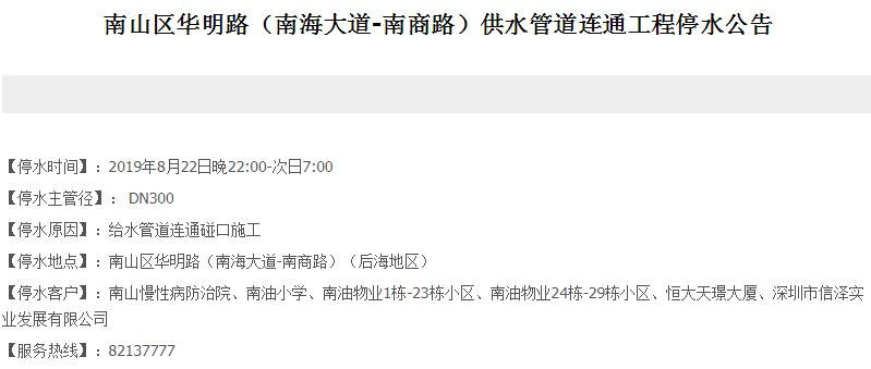 停水客戶:南山慢性病防治院、南油小學(xué)、南油物業(yè)1棟-23棟小區(qū)、南油物業(yè)24棟-29棟小區(qū)、恒大天璟大廈、深圳市信澤實業(yè)發(fā)展有限公司