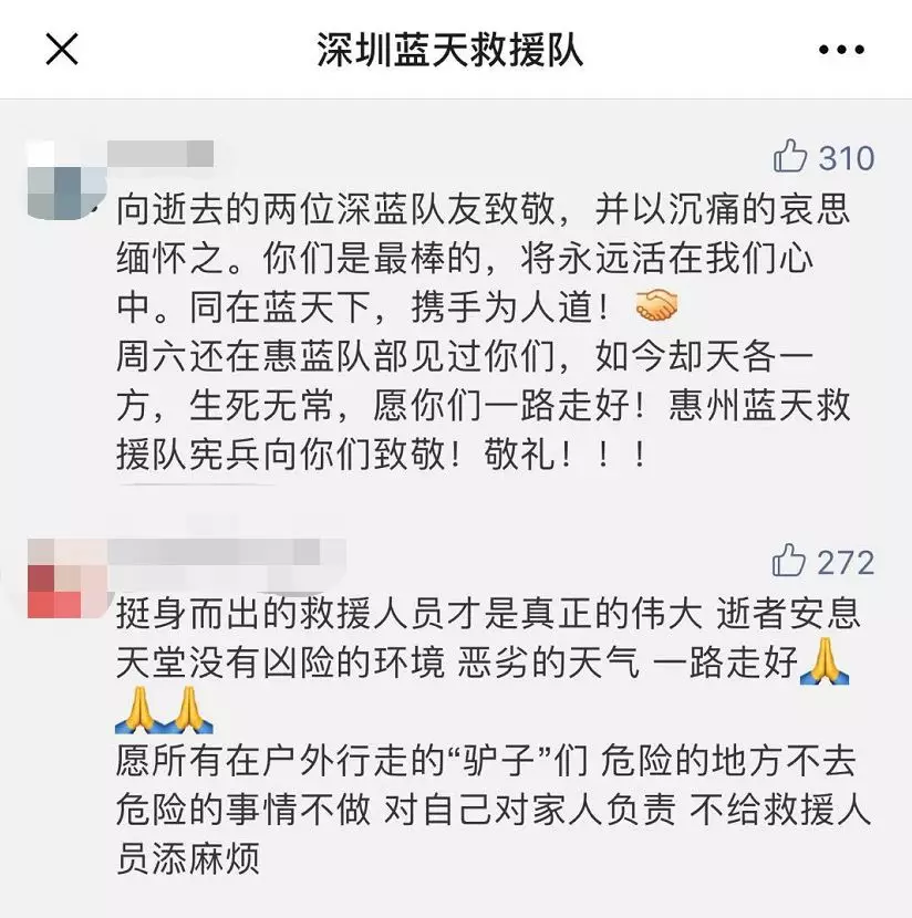 在深圳藍天救援隊微信留言中,有隊員悲痛惋惜隊友的離去,也有人質疑驢友,明知惡劣天氣卻還要前往山野探險,這種行為是對自己對他人生命的不負責。