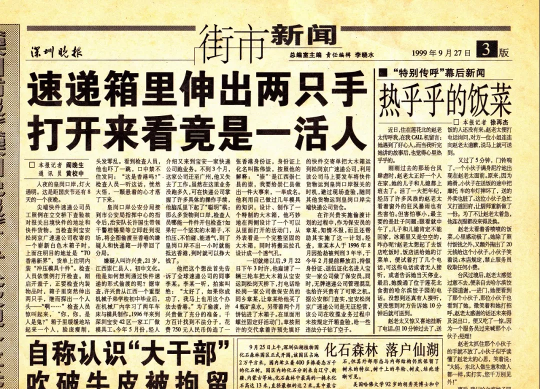 而歷史賦予這支鐵軍的特殊使命任務則是重拳打擊口岸走私和偷渡犯罪?;蕧徔诎杜沙鏊下毠す疱a梁至今還珍藏著一份些許泛黃的舊報紙,一篇名為“速遞箱里伸出兩只手,打開來看竟是一活人”的報道記錄了1999年9月22日曾發(fā)生的一起偷渡案件。作為當時參與處置的一員,桂錫梁回憶道,犯罪分子將自己裝進一個特制的大木箱中,偽裝成裝有“沖壓模具”發(fā)往香港的快遞箱,計劃偷渡出境,最終在位于皇崗口岸附近的快遞轉運點被警方查獲。