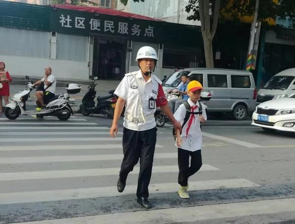 不停地牽手護(hù)送剛開學(xué)的學(xué)生過(guò)馬路。