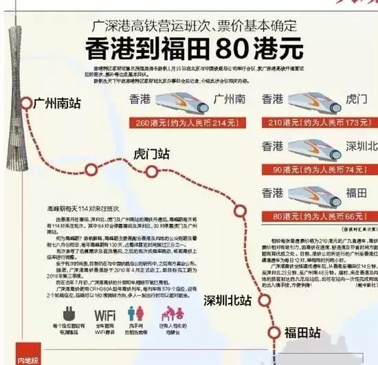 廣深港高鐵香港段,從香港西九龍總站發(fā)車(chē),到深圳福田站、深圳北站、虎門(mén)站和廣州南站票價(jià)基本確定為80港元、90港元、210港元和260港元。