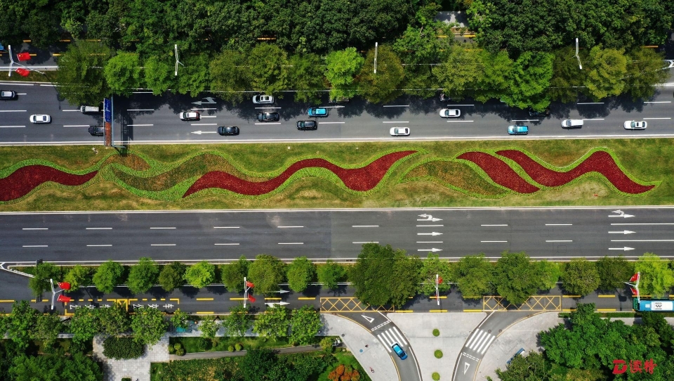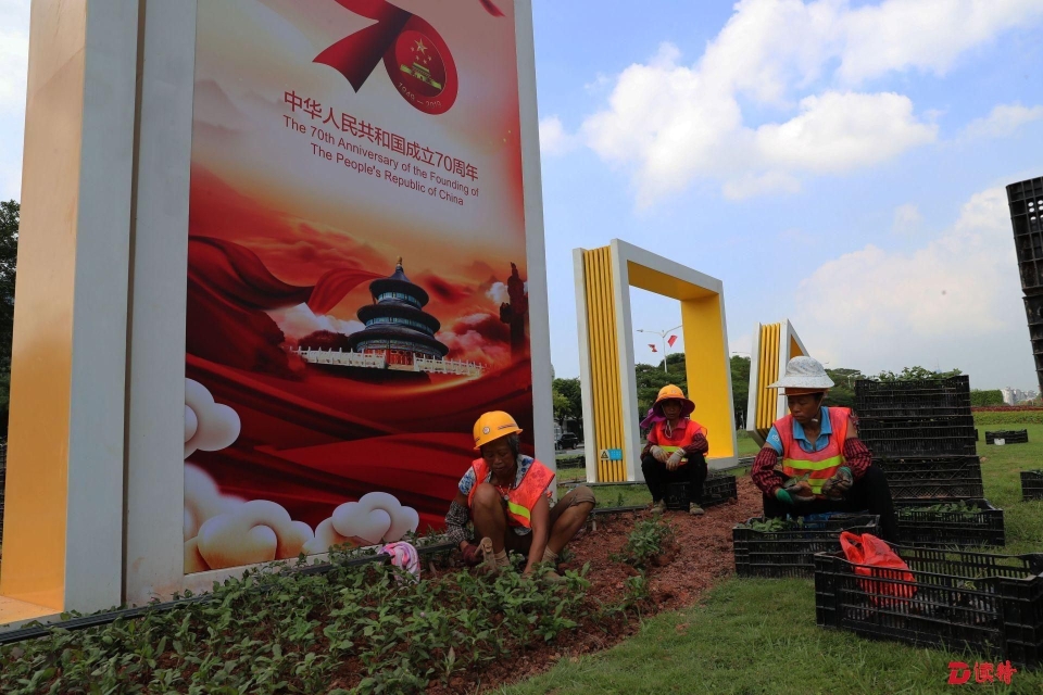 車輛行駛在深南大道上,沿路多處可以看到綠化工人們正在綠化帶上忙碌著,種植鮮花,修剪草坪,澆水養(yǎng)護。深南大道東段中間帶上,大紅色的赤壁,搭配藍色、粉色的大花香彩雀以及白里透粉的夏堇,共同組成了流線型的“鳳凰飛羽”圖案造型。從高處看去,綠化帶與兩側路燈上懸掛的鮮艷的國旗交相輝映,濃濃的節(jié)日氣息撲面而來。