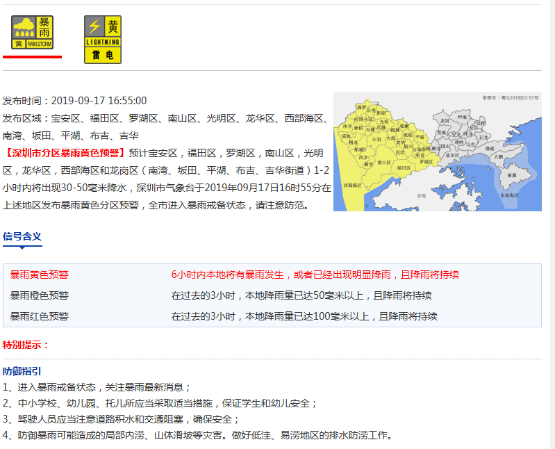 市氣象局預(yù)計寶安區(qū),福田區(qū),羅湖區(qū),南山區(qū),光明區(qū),龍華區(qū),西部海區(qū)和龍崗區(qū)(南灣、坂田、平湖、布吉、吉華街道)1-2小時內(nèi)將出現(xiàn)30-50毫米降水,深圳市氣象臺于2019年09月17日16時55分在上述地區(qū)發(fā)布暴雨黃色分區(qū)預(yù)警,全市進(jìn)入暴雨戒備狀態(tài),請注意防范。