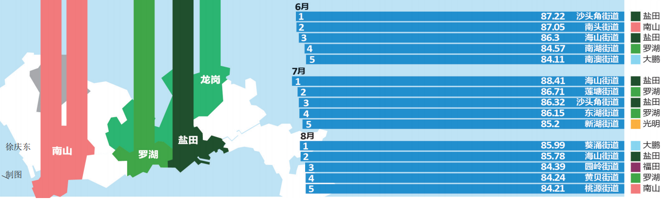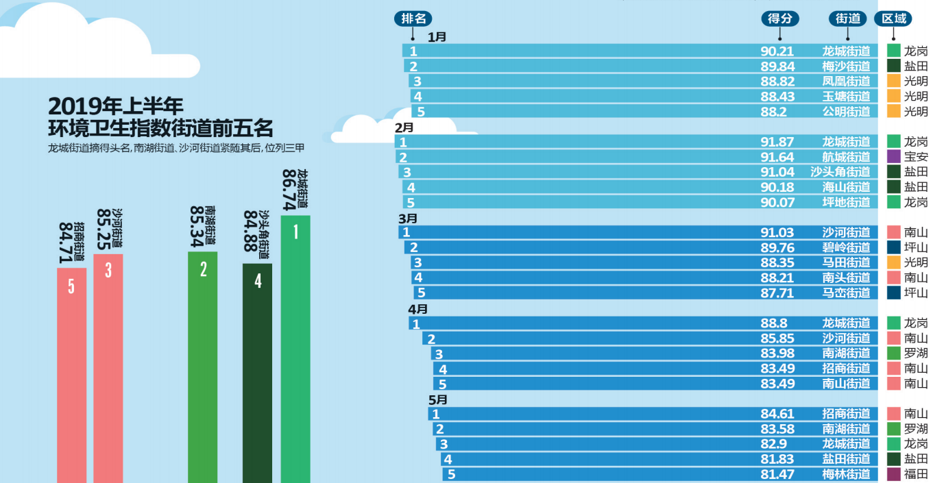 推進環(huán)境質量邁進國際一流,深圳一直在行動。細心的市民可能早已發(fā)現(xiàn),深圳市城市管理和綜合執(zhí)法局官方網站每個月都會發(fā)布“深圳市環(huán)境衛(wèi)生指數(shù)排行榜”,為深圳的環(huán)境衛(wèi)生“打分”。據(jù)了解,深圳市環(huán)境衛(wèi)生指數(shù)測評排名已連續(xù)開展了兩年半,有效促進了全市環(huán)境衛(wèi)生的提升和轉變。今年上半年的“成績單”顯示,全市各區(qū)(新區(qū))各街道你追我趕,測評工作帶動社區(qū)環(huán)境改善,環(huán)境衛(wèi)生的整治提升得到了市民的廣泛認可和好評。