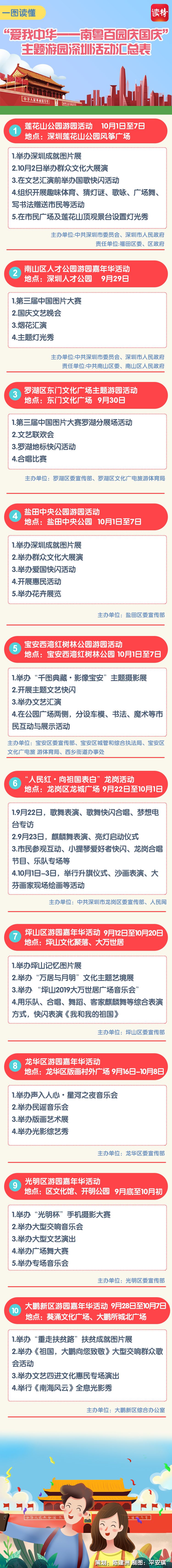為慶祝中華人民共和國(guó)成立70周年,深圳市將舉辦專場(chǎng)音樂會(huì)、群眾文藝晚會(huì)、焰火晚會(huì)等活動(dòng),同時(shí)將舉行10場(chǎng)“愛我中華——南粵百園慶國(guó)慶”主題游園及80場(chǎng)“我和我的祖國(guó)”國(guó)慶群眾文藝嘉年華活動(dòng)。主題游園和文藝嘉年華活動(dòng)安排如下: