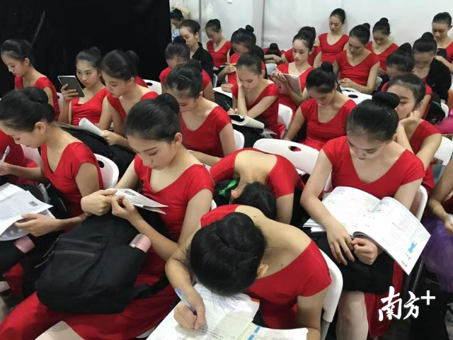在晚會的另一個彩排候場點,36名來自深圳高級中學舞蹈團的參演學生在彩排和演出間隙仍然抓緊學習。深圳高級中學舞蹈團老師高潔說,這是舞團候場的常態(tài),“為了不耽誤學習,經(jīng)常得抓緊間隙進行學習。”